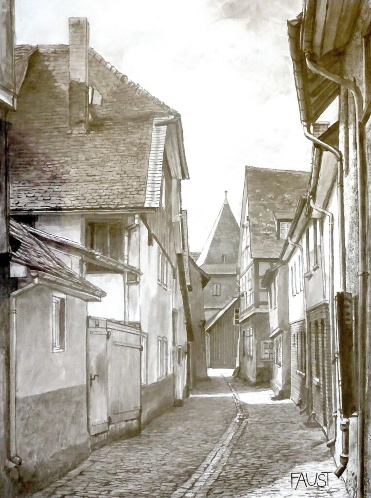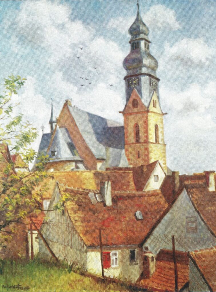 Werkauswahl Gemälde Vordertaunus Blick zum Feldberg The Bird (1989) Park in Frankfurt a. M. Portraits Selbstportrait Tierzeichnungen Wespenbussard Weißstorch Biene auf Blüte Hofheim Kirche St Peter und Paul, Hofheim Elternhaus Stephanstraße Hofheim, Ölgemälde Hofheim Burggrabengässchen Advertising Frankfurt – nicht zu fassen